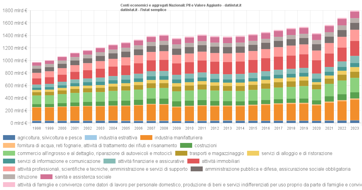 Impossibile visualizzare il grafico: Pil (prodotto interno lordo lato produzione ) Pil dal lato della produzione: è la somma del valore aggiunto ai prezzi base delle unità produttive residenti, più IVA, imposte sulle importazioni e imposte sui prodotti al netto dei contributi ai prodotti. L'indagine ha cadenza trimestrale, valutazione: prezzi correnti - valutazione Giu-2025